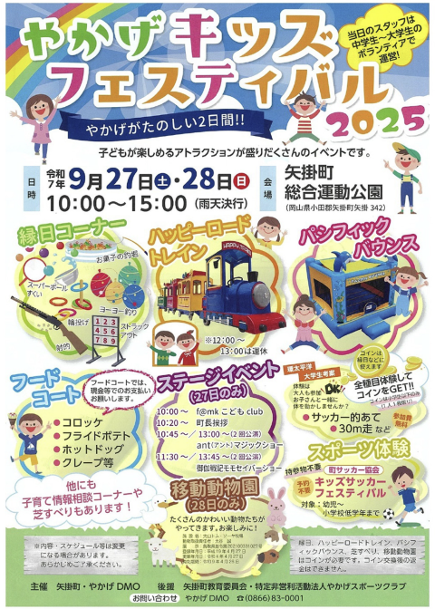 矢掛町総合運動公園で、秋空の下おもいっきり遊べる 「やかげキッズフェス」 が開催されます! 子どもたちが楽しめるアクティビティが盛りだくさんで、家族みんなで楽しめる2日間です。