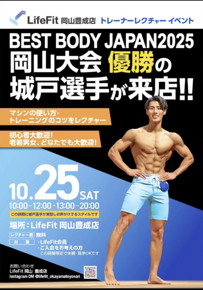 LifeFit岡山豊成店に、BEST BODY JAPAN 2025岡山大会 優勝・城戸優汰選手が来店し、