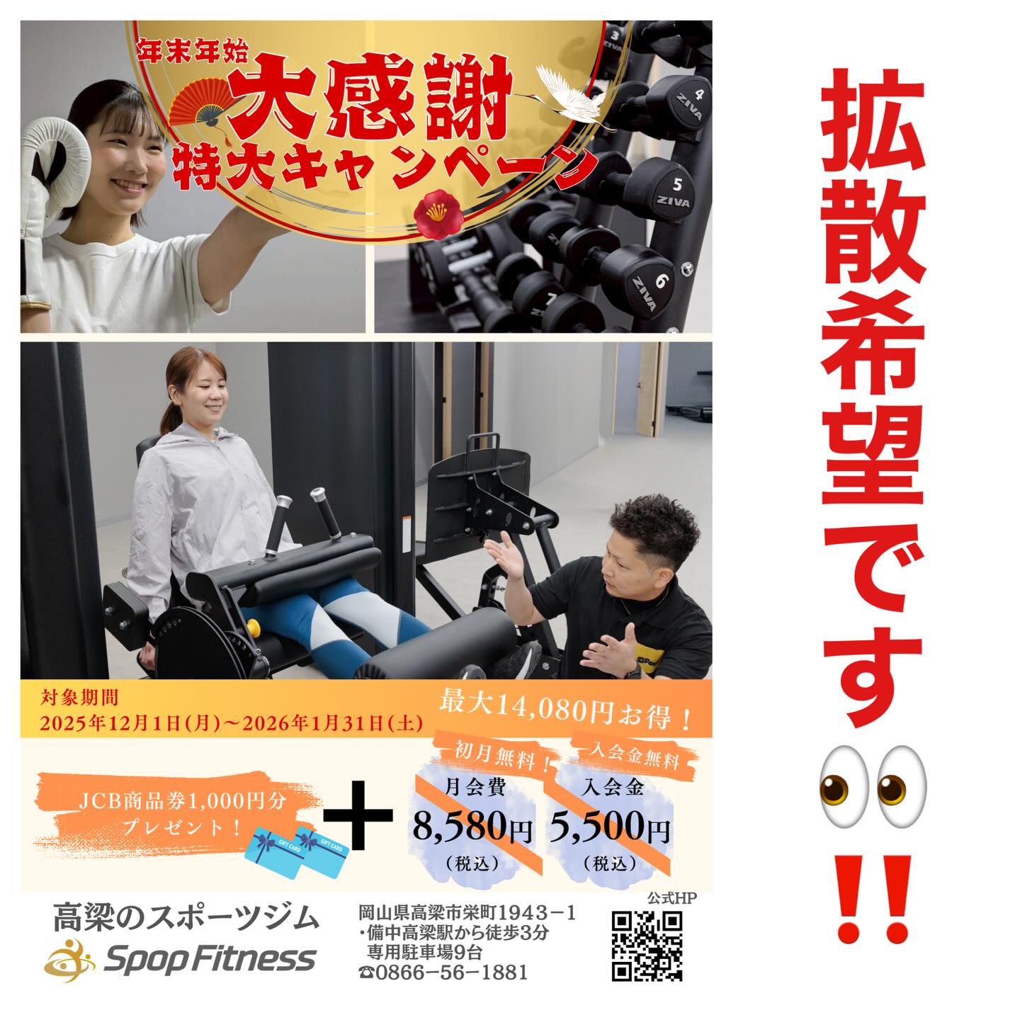 高梁市のフィットネスクラブ「SpopFitness」で、入会特典がつくキャンペーンが案内されています。