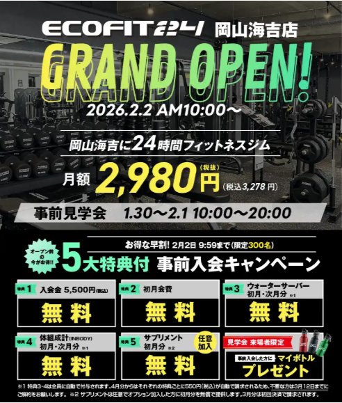 岡山市中区海吉に2026年2月2日(月)にオープンする「ECOFIT24 岡山海吉店」は、月額2,980円(税抜)で24時間利用できるコスパ抜群のフィットネスジムです。 入会キャンペーンも実施中ですので、お早めにお申し込みください。