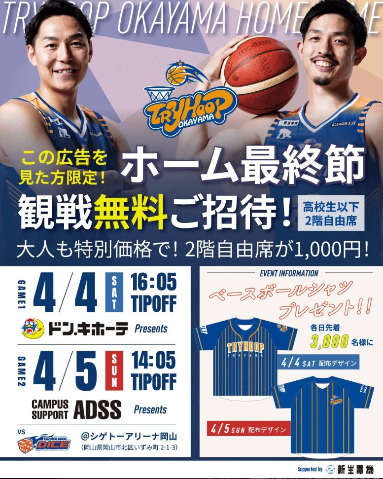 トライフープ岡山のホーム最終節がついに4月4日(土)、5日(日)にシゲトーアリーナ岡山で開催されます。