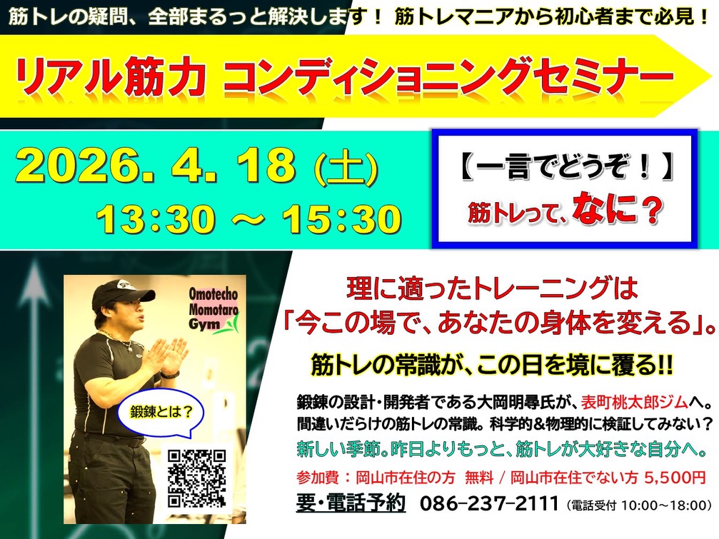 岡山市北区・表町の桃太郎ジムで、2026年4月18日(土)にリアル筋力コンディショニングセミナーが開催されます💪