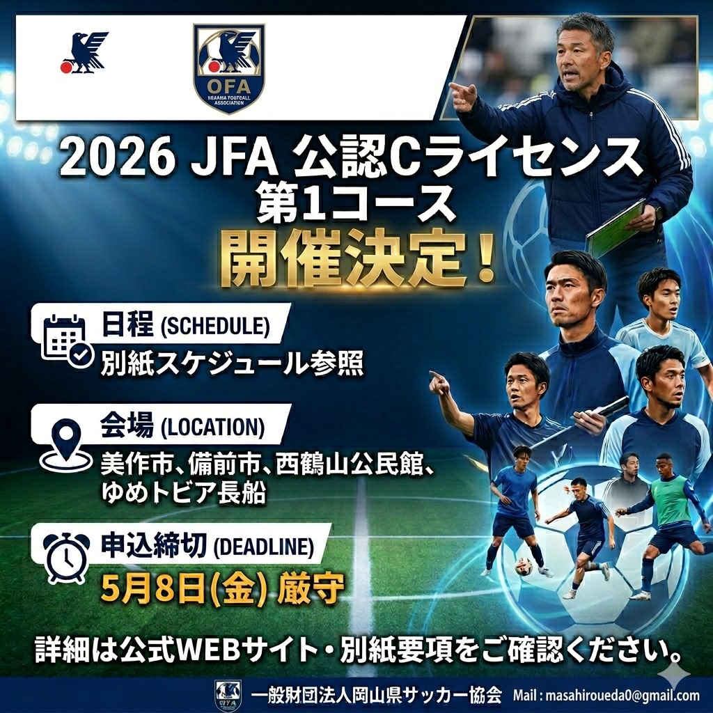 岡山県サッカー協会が主催する2026年度JFA公認Cライセンスコーチ養成講習会の開催が決定しました。