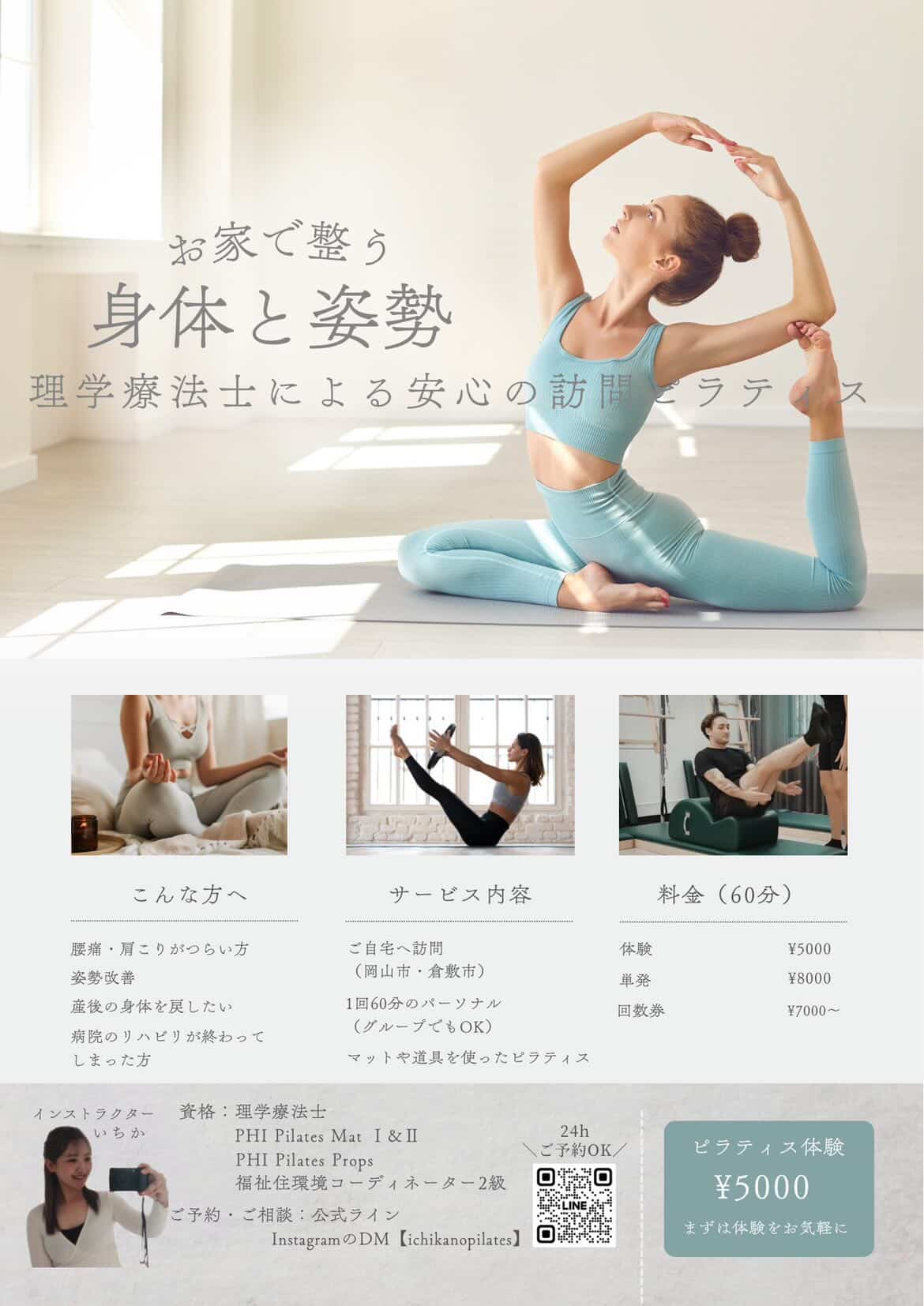 忙しくて時間がない、子どもがいて外出できない、痛みがあって移動がつらい……そんな方のために、岡山でご自宅で受けられる訪問ピラティスサービスが登場しました。