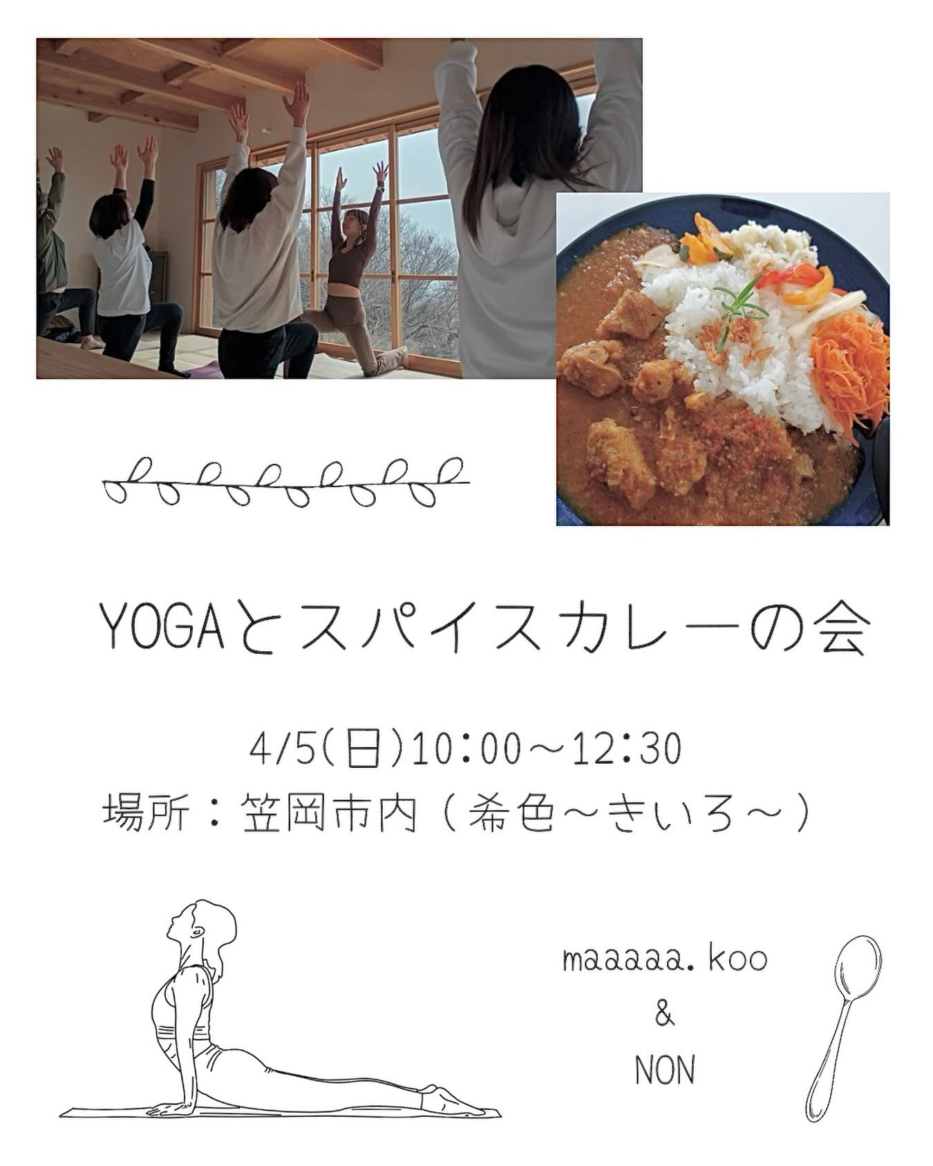 @non_yoga_pilateslife が主催する今回のイベントは、ヨガのポーズでエネルギーを巡らせデトックスしながら、身体を内側から整えるスパイスカレーもセットで楽しめる内容です。